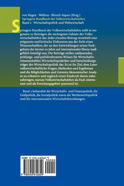 Springers Handbuch der VWL stellt in insgesamt 20 Beiträgen die wichtigsten Gebiete der Volkswirtschaftslehre vor. Die Beiträge enthalten umfassendes, prüfungs- und praxisrelevantes Wissen für Studenten, Praktiker und Wissenschaftler. Es ist ihr Ziel, dem Leser volkswirtschaftliche Fragen, Methoden und Ergebnisse und die Möglichkeiten und Grenzen ökonomischer Analyse zu erläutern und zugleich einen Eindruck davon nahezubringen, warum Volkswirtschaftslehre als Fach interessant ist. Band 2 behandelt die Wirtschafts- und Finanzpolitik, die Geldpolitik, die Sozialpolitik sowie die Wettbewerbspolitik und die internationalen Wirtschaftsbeziehungen.