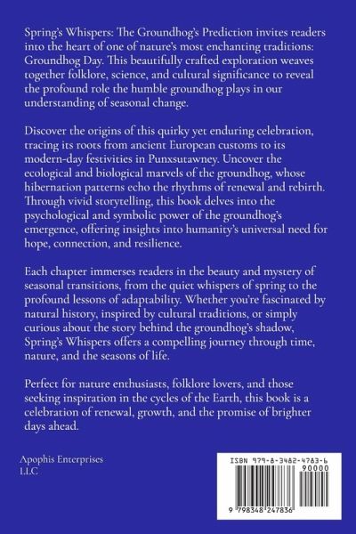 Spring's Whispers: The Groundhog's Prediction invites readers into the heart of one of nature's most enchanting traditions: Groundhog Day. This beautifully crafted exploration weaves together folklore, science, and cultural significance to reveal the profound role the humble groundhog plays in our understanding of seasonal change. Discover the origins of this quirky yet enduring celebration, tracing its roots from ancient European customs to its modern-day festivities in Punxsutawney. Uncover the ecological and biological marvels of the groundhog, whose hibernation patterns echo the rhythms of renewal and rebirth. Through vivid storytelling, this book delves into the psychological and symbolic power of the groundhog's emergence, offering insights into humanity's universal need for hope, connection, and resilience. Each chapter immerses readers in the beauty and mystery of seasonal transitions, from the quiet whispers of spring to the profound lessons of adaptability. Whether you're fascinated by natural history, inspired by cultural traditions, or simply curious about the story behind the groundhog's shadow, Spring's Whispers offers a compelling journey through time, nature, and the seasons of life. Perfect for nature enthusiasts, folklore lovers, and those seeking inspiration in the cycles of the Earth, this book is a celebration of renewal, growth, and the promise of brighter days ahead.