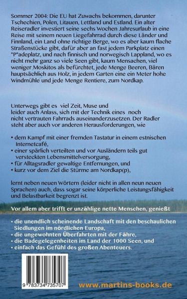 Sommer 2004: Die EU hat Zuwachs bekommen, darunter Tschechien, Polen, Litauen, Lettland und Estland. Ein alter Reiseradler investiert seinen Jahresurlaub in eine Reise mit seinem neuen Liegefahrrad durch diese Länder und Finnland, ein Land ohne richtige Berge, wo es aber kaum flache Straßenstücke gibt, dafür aber an fast jedem Parkplatz einen "P"adeplatz, und nach finnisch und norwegisch Lappland, wo es nicht mehr ganz so viele Seen gibt, kaum Menschen, viel weniger Moskitos als befürchtet, jede Menge Beeren, Bären hauptsächlich aus Holz, in jedem Garten eine ein Meter hohe Windmühle und jede Menge Rentiere, zum Nordkap. Unterwegs gibt es viel Zeit, Muse und leider auch Anlass, sich mit der Technik eines noch nicht vertrauten Fahrrads auseinanderzusetzen. Der Radler steht aber auch vor anderen Herausforderungen, wie dem Kampf mit einer fremden Tastatur in einem estnischen Internetcafé, einer spärlich verteilten und vor Ausländern teils gut versteckten Lebensmittelversorgung, für Alltagsradler gewaltigen Entfernungen, und kurz vor dem Ziel den Stürmen am Nordkap(p), lernt neben Fahrradtechnik und neuen Wörtern (leider nicht in allen 9 neuen Sprachen) auch, dass sogar seine körperliche Leistungsfähigkeit und Belastbarkeit begrenzt ist. Vor allem aber trifft er unzählige nette Menschen, genießt die unendlich scheinende Landschaft mit den beschaulichen Siedlungen im nördlichen Europa, die ungewohnten Überfahrten mit der Fähre, die Badegelegenheiten im Land der 1000 Seen, und einfach das Gefühl des großen Abenteuers.