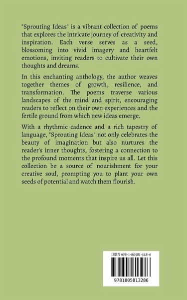 "Sprouting Ideas" is a vibrant collection of poems that explores the intricate journey of creativity and inspiration. Each verse serves as a seed, blossoming into vivid imagery and heartfelt emotions, inviting readers to cultivate their own thoughts and dreams. In this enchanting anthology, the author weaves together themes of growth, resilience, and transformation. The poems traverse various landscapes of the mind and spirit, encouraging readers to reflect on their own experiences and the fertile ground from which new ideas emerge. With a rhythmic cadence and a rich tapestry of language, "Sprouting Ideas" not only celebrates the beauty of imagination but also nurtures the reader's inner thoughts, fostering a connection to the profound moments that inspire us all. Let this collection be a source of nourishment for your creative soul, prompting you to plant your own seeds of potential and watch them flourish.