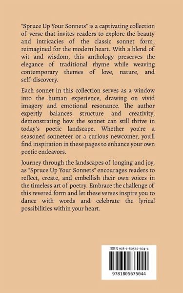 "Spruce Up Your Sonnets" is a captivating collection of verse that invites readers to explore the beauty and intricacies of the classic sonnet form, reimagined for the modern heart. With a blend of wit and wisdom, this anthology preserves the elegance of traditional rhyme while weaving contemporary themes of love, nature, and self-discovery. Each sonnet in this collection serves as a window into the human experience, drawing on vivid imagery and emotional resonance. The author expertly balances structure and creativity, demonstrating how the sonnet can still thrive in today's poetic landscape. Whether you're a seasoned sonneteer or a curious newcomer, you'll find inspiration in these pages to enhance your own poetic endeavors. Journey through the landscapes of longing and joy, as "Spruce Up Your Sonnets" encourages readers to reflect, create, and embellish their own voices in the timeless art of poetry. Embrace the challenge of this revered form and let these verses inspire you to dance with words and celebrate the lyrical possibilities within your heart.