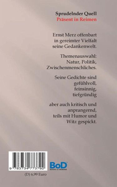 Sprudelnder QuellEin gereimtes Präsentvon Ernst MerzDer Autor offenbart in gereimter Vielfalt seine Gedankenwelt.Themenauswahl:Natur,Politik,ZwischenmenschlichesDie Gedichte sind gefühlvoll, feinsinnig, tiefgründig,aber auch kritisch und anprangernd,teils mit Humor und Witz gespickt.