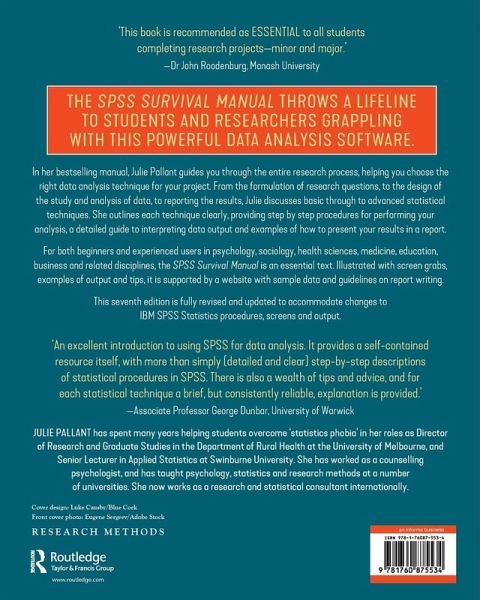 The SPSS Survival Manual throws a lifeline to students and researchers grappling with this powerful data analysis software. In her bestselling manual, Julie Pallant guides you through the entire research process, helping you choose the right data analysis technique for your project. From the formulation of research questions, to the design of the study and analysis of data, to reporting the results, Julie discusses basic through to advanced statistical techniques. She outlines each technique clearly, providing step by step procedures for performing your analysis, a detailed guide to interpreting data output and examples of how to present your results in a report. For both beginners and experienced users in psychology, sociology, health sciences, medicine, education, business and related disciplines, the SPSS Survival Manual is an essential text. Illustrated with screen grabs, examples of output and tips, it is supported by a website with sample data and guidelines on report writing. This seventh edition is fully revised and updated to accommodate changes to IBM SPSS Statistics procedures, screens and output. A website with support materials for students and lecturers is available at https://routledgetextbooks.com/textbooks/9781760875534