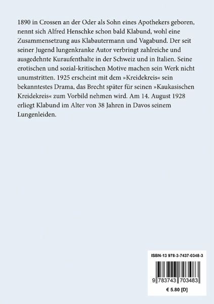 1890 in Crossen an der Oder als Sohn eines Apothekers geboren, nennt sich Alfred Henschke schon bald Klabund, wohl eine Zusammensetzung aus Klabautermann und Vagabund. Der seit seiner Jugend lungenkranke Autor verbringt zahlreiche und ausgedehnte Kuraufenthalte in der Schweiz und in Italien. Seine erotischen und sozial-kritischen Motive machen sein Werk nicht unumstritten. 1925 erscheint mit dem "Kreidekreis" sein bekanntestes Drama, das Brecht später für seinen "Kaukasischen Kreidekreis" zum Vorbild nehmen wird. Am 14. August 1928 erliegt Klabund im Alter von 38 Jahren in Davos seinem Lungenleiden.
