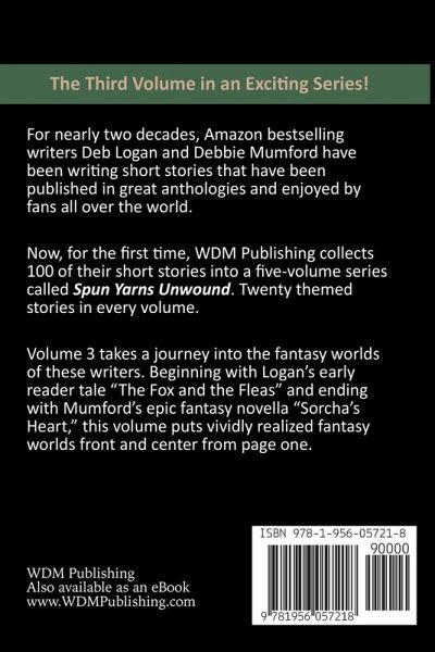 The Third Volume in an Amazing Series! For nearly two decades, Amazon bestselling writers Deb Logan and Debbie Mumford have been writing short stories that have been published in great anthologies and enjoyed by fans all over the world. Now, for the first time, they collect 100 of their short stories into a five-volume series called Spun Yarns Unwound. Twenty themed stories in every volume. Volume 3 takes a journey into the fantasy worlds of these writers. Beginning with Logan's early reader tale "The Fox and the Fleas" and ending with Mumford's epic fantasy novella "Sorcha's Heart," this volume puts vividly realized fantasy worlds front and center from page one.