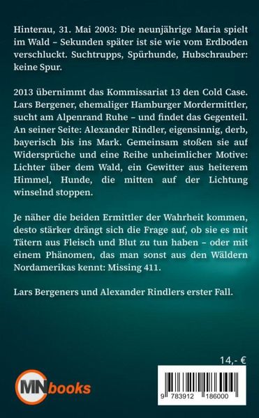 Hinterau, 31. Mai 2003: Die neunjährige Maria spielt im Wald - Sekunden später ist sie wie vom Erdboden verschluckt. Suchtrupps, Spürhunde, Hubschrauber: keine Spur.2013 übernimmt das Kommissariat 13 den Cold Case. Lars Bergener, ehemaliger Hamburger Mordermittler, sucht am Alpenrand Ruhe - und findet das Gegenteil. An seiner Seite: Alexander Rindler, eigensinnig, derb, bayerisch bis ins Mark. Gemeinsam stoßen sie auf Widersprüche und eine Reihe unheimlicher Motive: Lichter über dem Wald, ein Gewitter aus heiterem Himmel, Hunde, die mitten auf der Lichtung winselnd stoppen.Je näher die beiden Ermittler der Wahrheit kommen, desto stärker drängt sich die Frage auf, ob sie es mit Tätern aus Fleisch und Blut zu tun haben - oder mit einem Phänomen, das man sonst aus den Wäldern Nordamerikas kennt: Missing 411.Lars Bergeners und Alexander Rindlers erster Fall.