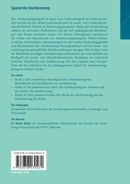 Der Anerkennungsbegriff ist heute zum Schlüsselbegriff der Ethik geworden und hat als ein solcher zunehmend auch im sozial- und erziehungswissenschaftlichen Diskurs an Bedeutung gewonnen. Dabei gilt Anerkennung vielfach als normative Richtschnur, mit der sich (pädagogische) Beziehungen und Praxen bewerten lassen. Vor diesem Hintergrund unternimmt die Arbeit eine Spurensuche zur Anerkennungskategorie. Mittels Rekonstruktion verschiedener Anerkennungskonzepte werden Bedeutungsgehalte und Dimensionen der 'Anerkennung' herausgearbeitet und auf sozial- und erziehungswissenschaftliche Problemstellungen bezogen. Die Studien loten die Reichweite jeweiliger Anerkennungsverständnisse aus und entfalten im Rückgriff auf macht- und alteritätstheoretische Positionen ein analytisch justiertes Verständnis von Anerkennung, mit dem zugleich neue Perspektiven auf den ethischen wie den pädagogischen Gehalt der Anerkennungskategorie eröffnet werden.