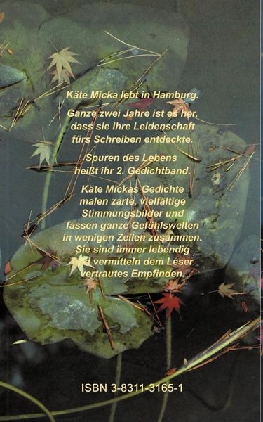 Käte Micka lebt in Hamburg. Eine Ihrer wichtigsten Lebenserfahreungen besagt, dass man auch noch spät ganz neue Wege gehen kann.Für Käte Micka sind Gedanken Schätze, die nicht verloren gehen sollten. Einige davon hat sie in diesem Gedichtband, ihrem dritten, aufbewahrt. Neben der Lyrik widmet sich Käte Micka der Musik,spielt und singt mit Leidenschaft ihre eigenen Kompositionen.Sie lacht gerne und glaubt an die Macht des Unterbewußtseins.