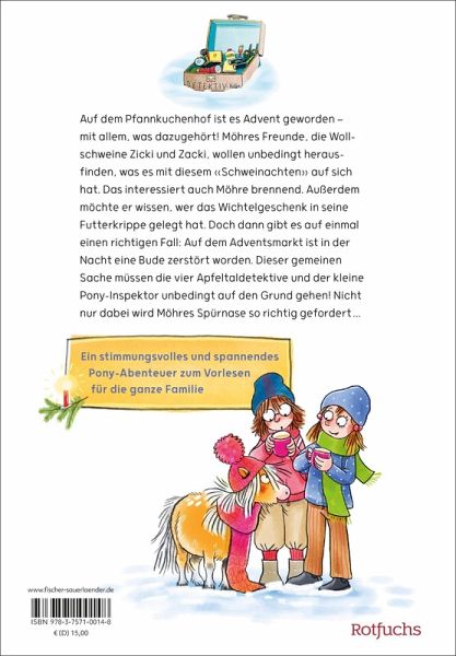 Auf dem Pfannkuchenhof ist es Advent geworden - mit allem, was dazugehört! Auch Inspektor Möhre hat ein Wichtelgeschenk in seiner Futterkrippe gefunden. Natürlich will er sofort herausfinden, wer sein Wichtel ist. Und dann gibt es ganz plötzlich noch einen richtigen Fall für den kleinen Ponydetektiv und seine Apfeltaldetektive! Auf dem Adventsmarkt ist in der Nacht eine Bude zerstört worden. Dieser gemeinen Sache müssen die vier Detektive und der kleine Pony-Insepktor unbedingt auf den Grund gehen! Ob sie herausfinden, wer hier seine Spuren hinterlassen hat?
