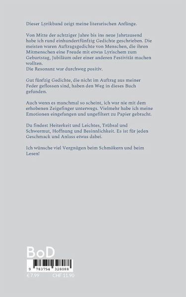 Dieser Lyrikband zeigt meine literarischen Anfänge.Von Mitte der achtziger Jahre bis ins neue Jahrtausend habe ich rund einhundertfünfzig Gedichte geschrieben. Die meisten waren Auftragsgedichte von Menschen, die ihren Mitmenschen eine Freude mit etwas Lyrischem zum Geburtstag, Jubiläum oder einer anderen Festivität machen wollten.Die Resonanz war durchweg positiv.Gut fünfzig Gedichte, die nicht im Auftrag aus meiner Feder geflossen sind, haben den Weg in dieses Buch gefunden.Auch wenn es manchmal so scheint, ich war nie mit dem erhobenen Zeigefinger unterwegs. Vielmehr habe ich meine Emotionen eingefangen und ungefiltert zu Papier gebracht.Du findest Heiterkeit und Leichtes, Trübsal und Schwermut, Hoffnung und Besinnlichkeit. Es ist für jeden Geschmack und Anlass etwas dabei.Ich wünsche viel Vergnügen beim Schmökern und beim Lesen!