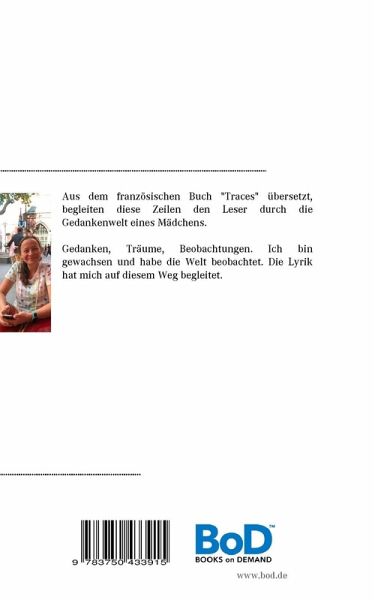 Aus dem französischen Buch "Traces" übersetzt, begleiten diese Zeilen den Leser durch die Gedankenwelt eines Mädchens.Gedanken, Träume, Beobachtungen. Ich bin gewachsen und habe die Welt beobachtet. Die Lyrik hat mich auf diesem Weg begleitet.