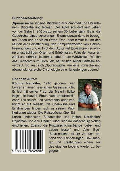 'Spurensuche' Ist eine Mischung aus Wahrheit und Erfundenem, Biografie und Roman. Der Autor schildert sein Leben von der Geburt 1940 bis zu seinem 30. Lebensjahr. Es ist die Geschichte eines schwierigen Erwachsenwerdens in bewegten Zeiten und an vielen Orten. Der Leser nimmt teil an den Mühen der Selbstfindung, den Kompliziertheiten der Liebesbeziehungen und er folgt dem Autor auf Exkursionen zu erinnerungsrächtigen Orten und Erlebnissen. Der Erzähler berichtet von seiner "zweiten Heimat" Griechenland (Pilion), von Gipfelbesteigungen auf den Mosesberg im Sinai und den Ayer's Rock in Australien…mehr