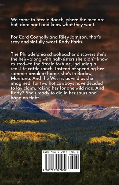 Welcome to Steele Ranch, where the men are hot and know what they want. For Cord Connolly and Riley Townsend, that's sinfully sweet Kady Parks. The Philadelphia schoolteacher discovers she's the heir--along with half-sisters she didn't know existed--to the Steele fortune, including a real-life cattle ranch. Instead of spending her summer break at home, she's in Barlow, Montana. And the West is as wild as she imagined, for two hot cowboys have decided she's theirs. And Kady? She's ready to dig in her spurs and hang on tight.