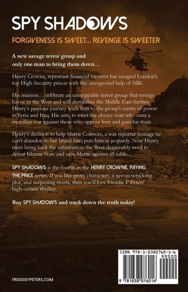 The most wanted INTERPOL fugitive, The most destructive Terror Group in the world, The most impossible British Intelligence Services' mission... Henry Crowne, disgraced financier and former IRA operative has escaped London's top high-security prison with the unexpected help of MI6. His mission...infiltrate an emerging terror group that has already claimed many lives in the West and threatens to destabilise the Middle East further. Henry's perilous journey leads him to the group's centre of power in Syria and Iraq. His aim, to meet the elusive man who runs a merciless war against those who oppose him. But Henry decides to help Mattie Colmore, a war reporter hostage. Can he still hide in plain sight, bring back the information the West desperately need to defeat Islamic State and save Mattie at the same time? SHY SHADOWS is an political and espionage thriller, the fourth in the "Henry Crowne, Paying The Price" series. If you liked Rob Sinclair's SLEEPER 13, L.T Ryan's NOBLE BEGINNINGS or the TV series MacMafia or Spooks, you will enjoy the twists and turns of Freddie P Peters' latest fierce-paced thriller. Discover it now...
