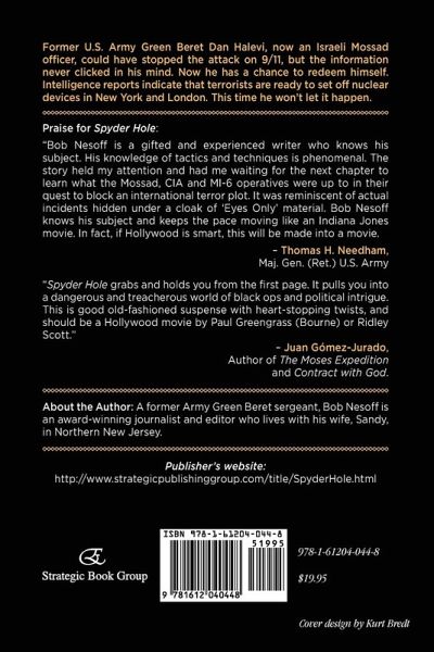 Former U.S. Army Green Beret Dan Halevi, now an Israeli Mossad officer, could have stopped the attack on 9/11, but the information never clicked in his mind. Now he has a chance to redeem himself. Intelligence reports indicate that terrorists are ready to set off nuclear devices in New York and London. This time he won't let it happen. Praise for Spyder Hole:Bob Nesoff is a gifted and experienced writer who knows his subject. His knowledge of tactics and techniques is phenomenal. The story held my attention and had me waiting for the next chapter to learn what the Mossad, CIA and MI-6 operatives were up to in their quest to block an international terror plot. It was reminiscent of actual incidents hidden under a cloak of 'Eyes Only' material. Nesoff knows his subject and keeps the pace moving like an Indiana Jones movie. In fact, if Hollywood is smart, this will be made into a movie. - Thomas H. Needham, Maj. Gen. (Ret.) U.S. Army Spyder Hole grabs and holds you from the first page. It pulls you into a dangerous and treacherous world of black ops and political intrigue. This is good old-fashioned suspense with heart-stopping twists, and should be a Hollywood movie by Paul Greengrass (Bourne) or Ridley Scott." - Juan Gómez-Jurado, of The Moses Expedition and Contract with God About the Author: A former Army Green Beret sergeant, Bob Nesoff is an award-winning journalist and editor who lives with his wife, Sandy, in Northern New Jersey.Publisher's website: http://www.strategicpublishinggroup.com/title/SpyderHole.html