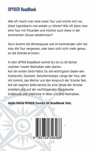 Das Buch für den Can-Am SPYDER Fahrer!In diesem Buch kannst Du Deine schönsten Touren festhalten oder neue planen.Auf der ersten Seite hältst Du die wichtigsten Daten wie Startpunkt, Startzeit, Zwischenstopps, Länge der Tour, wer mit kommt, das Wetter und den Anspruch der Strecke fest. Auf der zweiten Seite kannst Du eine Skizze der Strecke erstellen und auf der folgenden Doppelseite die Tour beschreiben und mit Bildern festhalten