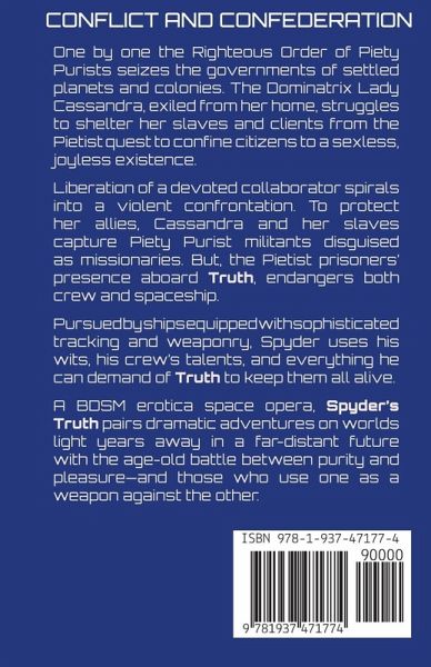 Conflict and Confederation One by one the Righteous Order of Piety Purists seizes the governments of settled planets and colonies. The Dominatrix Lady Cassandra, exiled from her home, struggles to shelter her slaves and clients from the Pietist quest to confine citizens to a sexless, joyless existence. Liberation of a devoted collaborator spirals into a violent confrontation. To protect her allies, Cassandra and her slaves capture Piety Purist militants disguised as missionaries. But, the Pietist prisoners' presence aboard Truth, endangers both crew and spaceship. Pursued by ships equipped with sophisticated tracking and weaponry, Spyder uses his wits, his crew's talents, and everything he can demand of Truth to keep them all alive. A BDSM erotica space opera, Spyder's Truth pairs dramatic adventures on worlds light years away in a far distant future with the age-old battle between purity and pleasure-and those who use one as a weapon against the other.