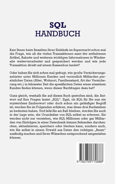 Kam Ihnen beim Bezahlen Ihrer Einkäufe im Supermarkt schon mal die Frage, wie all die vielen Transaktionen samt der enthaltenen Artikel, Rabatte und weiteren wichtigen Informationen in Windeseile weiterverarbeitet und gespeichert werden und wie jede Transaktion direkt auf einem Kassenbon landet? Oder haben Sie sich schon mal gefragt, wie große Versicherungsanbieter unter Millionen Kunden und vermutlich Milliarden persönlicher Daten (Alter, Wohnort, Familienstand, Art der Versicherung etc.) in kürzester Zeit die spezifischen Daten eines einzelnen Kunden finden können, wenn dieser Nachfragen dazu hat? Ganz gleich, weshalb Sie auf dieses Buch gestoßen sind, die Antwort auf Ihre Fragen lautet ,,SQL''. Egal, ob SQL für Sie nun ein mysteriöses Zauberwort oder doch schon ein geläufiger Begriff ist, werden Sie im Folgenden erfahren, was diese drei Buchstaben zu bedeuten haben. Und falls Sie am Ball bleiben, werden Sie auch in der Lage sein, die Grundsätze von SQL selbst zu erlernen. Sie werden nicht nur verstehen, wie SQL Millionen oder gar Milliarden von Einträgen in einer Datenbank binnen Sekunden durchsuchen, aktualisieren, speichern oder löschen kann, sondern auch, wie Sie selbst in einem Urwald aus Daten den richtigen ,,Baum'' ausfindig machen und Ihren Wünschen entsprechend umgestalten können.