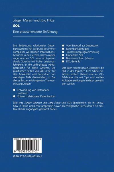1 Kurzer Abriß der Entwicklung von Datenbanksystemen.- 1.1 Sinn von Datenbanksystemen.- 1.2 Entwicklungsgeschichte der Datenbanksysteme.- 1.3 Hierarchisches Modell.- 1.4 Netzwerkmodell.- 1.5 Relationales Modell.- Zusammenfassung.- 2 Entwurf relationaler Datenbanken.- 2.1 Das Drei-Ebenen Modell.- 2.2 Der Entity-Relationship Entwurf.- 2.3 Vom ER-Modell zur relationalen Datenbank.- 2.4 Normalisierung.- Zusammenfassung.- Übungen.- 3 SQL Überblick.- Zusammenfassung.- 4 Vom Entwurf zur Datenbank.- Zusammenfassung.- Übungen.- 5 Datenbank Abfragen.- 5.1 Einfache Abfragen.- 5.2 Built-In Funktionen und Arithmetik.- 5.3 GROUP BY ... HAVING.- 5.4 Joins I: Inner Joins.- 5.5 Ein Modell für SELECT.- 5.6 Joins II: Outer Joins.- 5.7 Subqueries I: Single-Row-Subqueries.- 5.8 Subqueries II: Multiple-Row-Subqueries.- 5.9 Subqueries III: Correlated Subqueries.- 5.10 Kombination von unabhängigen Abfragen.- 5.11 Weitere Beispiele zu SELECT.- Zusammenfassung.- Übungen.- 6 Transaktionsprogrammierung.- 6.1 Das Transaktionskonzept.- 6.2 INSERT.- 6.3 DELETE.- 6.4 UPDATE.- 6.5 Probleme mit DELETE und UPDATE.- 6.6 SQL-Programme.- Zusammenfassung.- Übungen.- 7 Embedded SQL.- Zusammenfassung.- 8 Benutzersichten (Views).- 8.1 Vorteile und Grenzen von Views.- 8.2 Erstellen von Views.- 8.3 Views zur Datenaktualisierung.- 8.4 Views auf mehrere Tabellen.- 8.5 Löschen von Views.- 8.6 Viewspeicherung in Systemtabellen.- Zusammenfassung.- Übungen.- 9 DCL - Befehle.- 9.1 Benutzer und ihre Rechte.- 9.2 Tabellenzugriffsarten.- 9.3 Zugriff auf das SQL-System.- Zusammenfassung.- Übungen.- Syntax der SQL-Befehle.- Lösungen zu ausgewählten Übungen.- Sachwortverzeichnis.