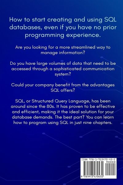 How to start creating and using SQL databases, even if you have no prior programming experience. Are you looking for a more streamlined way to manage information? Do you have large volumes of data that need to be accessed through a sophisticated communication system? Could your company benefit from the advantages SQL offers? SQL, or Structured Query Language, has been around since the 80s. It has proven to be effective and efficient, making it the ideal solution for your database demands. The best part? You can learn how to program using SQL in just nine chapters. SQL introduces you to the basics of programming using comprehensive examples and step by step practice problems that set you up for success. In addition, you'll discover: How to create your very first database Clauses to help you retrieve data Data manipulation functions The basics of queries and subqueries Transaction processing management Step by step instructions and walkthroughs to help you start programming right away And so much more! You don't have to be intimidated by the complexities of database management. With SQL, all your data problems can be solved. Click "add to cart" to learn how to take advantage of the powers of SQL and learn to wield them yourself.