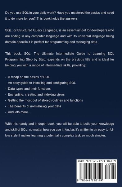 Do you use SQL in your daily work? Have you mastered the basics and need it to do more for you? This book holds the answers! SQL, or Structured Query Language, is an essential tool for developers who are coding in any computer language and with its universal language being domain-specific it is perfect for programming and managing data. This book, SQL: The Ultimate Intermediate Guide to Learning SQL Programming Step by Step, expands on the previous title and is ideal for helping you with a range of intermediate skills, providing: - A recap on the basics of SQL - An easy guide to installing and configuring SQL - Data types and their functions - Encrypting, creating and indexing views - Getting the most out of stored routines and functions - The benefits of normalizing your data - And more… With this handy and in-depth book, you will be able to build your knowledge and skill of SQL, no matter how you use it. And as it’s written in an easy-to-follow style it makes learning a potentially complex task so much simpler. Get your copy now!