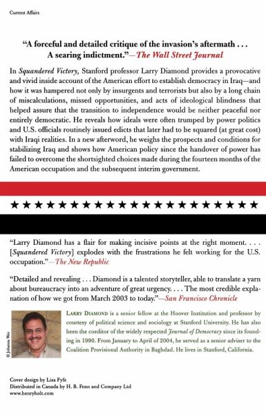 America's leading expert on democracy delivers the first insider's account of the U.S. occupation of Iraq-a sobering and critical assessment of America's effort to implant democracy In the fall of 2003, Stanford professor Larry Diamond received a call from Condoleezza Rice, asking if he would spend several months in Baghdad as an adviser to the American occupation authorities. Diamond had not been a supporter of the war in Iraq, but he felt that the task of building a viable democracy was a worthy goal now that Saddam Hussein's regime had been overthrown. He also thought he could do some good by putting his academic expertise to work in the real world. So in January 2004 he went to Iraq, and the next three months proved to be more of an education than he bargained for. Diamond found himself part of one of the most audacious undertakings of our time. In Squandered Victory he shows how the American effort to establish democracy in Iraq was hampered not only by insurgents and terrorists but also by a long chain of miscalculations, missed opportunities, and acts of ideological blindness that helped assure that the transition to independence would be neither peaceful nor entirely democratic. He brings us inside the Green Zone, into a world where ideals were often trumped by power politics and where U.S. officials routinely issued edicts that later had to be squared (at great cost) with Iraqi realities. His provocative and vivid account makes clear that Iraq-and by extension, the United States-will spend many years climbing its way out of the hole that was dug during the fourteen months of the American occupation.