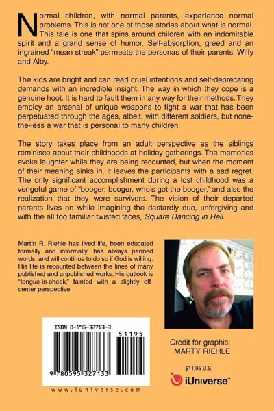 Normal children, with normal parents, experience normal problems. This is not one of those stories about what is normal. This tale is one that spins around children with an indomitable spirit and a grand sense of humor. Self-absorption, greed and an ingrained "mean streak" permeate the personas of their parents, Wilfy and Alby. The kids are bright and can read cruel intentions and self-deprecating demands with an incredible insight. The way in which they cope is a genuine hoot. It is hard to fault them in any way for their methods. They employ an arsenal of unique weapons to fight a war that has been perpetuated through the ages, albeit, with different soldiers, but none-the-less a war that is personal to many children. The story takes place from an adult perspective as the siblings reminisce about their childhoods at holiday gatherings. The memories evoke laughter while they are being recounted, but when the moment of their meaning sinks in, it leaves the participants with a sad regret. The only significant accomplishment during a lost childhood was a vengeful game of "booger, booger, who's got the booger," and also the realization that they were survivors. The vision of their departed parents lives on while imagining the dastardly duo, unforgiving and with the all too familiar twisted faces, Square Dancing in Hell.