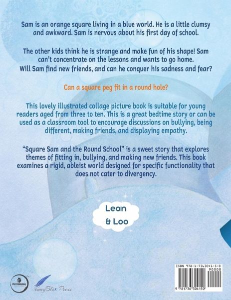 Square Sam and the Round School is a sweet story which explores themes of fitting in, bullying, and making new friends. This book examines a rigid, ableist world designed for specific functionality that does not cater for divergency. Sam is an orange square living a blue world. He is a little clumsy and awkward and he's nervous for his first day of school. The other kid's think he is strange and make fun of his shape! Sam can't concentrate on the lessons and just wants to go home. Will Sam find new friends and can he conquer his sadness and fear? Can a square peg fit in a round hole? This lovely illustrated collage picture book is suitable for young readers aged from three to ten. This is a great bedtime story or can be used as a classroom tool to encourage discussions on, bullying being different, making friends, and displaying empathy.