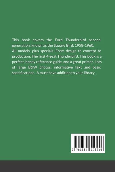 This book covers the second generation Ford Thunderbird, the "Square Bird". 1958-1960. All models plus specials. Lots of detail and large B&W photos, interesting text, and basic specifications. It's a handy reference guide and perfect primer. A must have addition to your library.