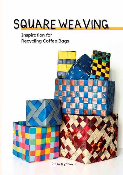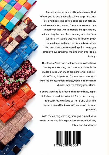 Square weaving is a crafting technique that allows you to easily recycle coffee bags into baskets and bags. The coffee bags are cut, folded, and woven into squares. These squares are then joined together with materials like gift ribbon, eliminating the need for a sewing machine. You can also try square weaving with other plastic package material that is in a bag shape.You can start square weaving with items you already have at home, making it an affordable hobby. The Square Weaving book provides instructions for square weaving and its adaptations. It includes a wide variety of projects for all skill levels, offering inspiration for your own creations. With the measurement tables, you'll find the right dimensions for folding your strips. Square weaving is a fascinating technique, especially because of its potential for pattern design. You can create unique patterns and align the designs on coffee bags with precision for your projects. With coffee bag weaving, you give a new life to waste by turning it into practical storage baskets, totes, and handbags.