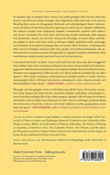 In Squatter Life, sociologist Javier Auyero and anthropologist Sofía Servián detail the diverse and often precarious strategies that Argentina's urban poor rely on to survive. Blending three years of ethnographic fieldwork and anthropological theory with personal narratives of Servián's experience growing up and living in a squatter settlement, the authors examine how Argentina's squatter communities contend with violence and secure necessities like food, land, and housing despite inadequate state support and protection. Auyero and Servián recount the bricolage of tactics these individuals employ to make ends meet, such as relying on highly exploitative jobs, patronage, and networks of reciprocal exchange that can involve illicit activities. Analyzing how these survival strategies intersect with class, gender, and political domination, the authors present a nuanced account of marginality in Argentinian squatter settlements while maintaining a deeply human portrait of survival and persistence.