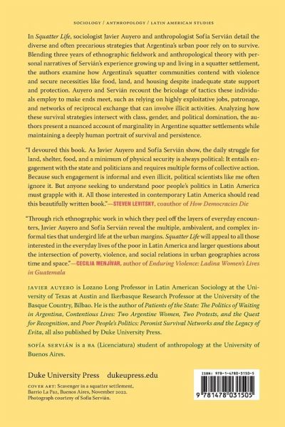 In Squatter Life, sociologist Javier Auyero and anthropologist Sofía Servián detail the diverse and often precarious strategies that Argentina's urban poor rely on to survive. Blending three years of ethnographic fieldwork and anthropological theory with personal narratives of Servián's experience growing up and living in a squatter settlement, the authors examine how Argentina's squatter communities contend with violence and secure necessities like food, land, and housing despite inadequate state support and protection. Auyero and Servián recount the bricolage of tactics these individuals employ to make ends meet, such as relying on highly exploitative jobs, patronage, and networks of reciprocal exchange that can involve illicit activities. Analyzing how these survival strategies intersect with class, gender, and political domination, the authors present a nuanced account of marginality in Argentinian squatter settlements while maintaining a deeply human portrait of survival and persistence.