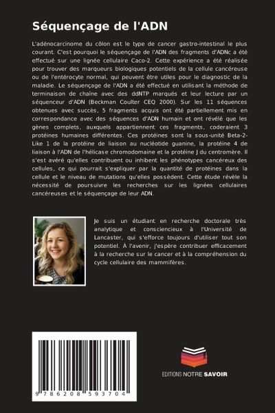 L'adénocarcinome du côlon est le type de cancer gastro-intestinal le plus courant. C'est pourquoi le séquençage de l'ADN des fragments d'ADNc a été effectué sur une lignée cellulaire Caco-2. Cette expérience a été réalisée pour trouver des marqueurs biologiques potentiels de la cellule cancéreuse ou de l'entérocyte normal, qui peuvent être utiles pour le diagnostic de la maladie. Le séquençage de l'ADN a été effectué en utilisant la méthode de terminaison de chaîne avec des ddNTP marqués et leur lecture par un séquenceur d'ADN (Beckman Coulter CEQ 2000). Sur les 11 séquences obtenues avec succès, 5 fragments acquis ont été partiellement mis en correspondance avec des séquences d'ADN humain et ont révélé que les gènes complets, auxquels appartiennent ces fragments, coderaient 3 protéines humaines différentes. Ces protéines sont la sous-unité Beta-2-Like 1 de la protéine de liaison au nucléotide guanine, la protéine 4 de liaison à l'ADN de l'hélicase chromodomaine et la protéine J du centromère. Il s'est avéré qu'elles contribuent ou inhibent les phénotypes cancéreux des cellules, ce qui pourrait s'expliquer par la quantité de protéines dans la cellule et le niveau de mutations qu'elles possèdent. Cette étude révèle la nécessité de poursuivre les recherches sur les lignées cellulaires cancéreuses et le séquençage de leur ADN.