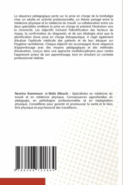 La séquence pédagogique porte sur la prise en charge de la lombalgie chez un adulte en activité professionnelle, un thème partagé entre la médecine physique et la médecine du travail. La collaboration entre ces deux spécialités améliore la prise en charge et prévient l'évolution vers la chronicité. Les objectifs incluent l'identification des facteurs de risque, la confirmation du diagnostic et de son étiologie ainsi que la planification d'une prise en charge thérapeutique. Il s'agit également d'évaluer l'aptitude médicale des patients et de leur éduquer sur l'hygiène rachidienne. Chaque objectif est accompagné d'une séquence d'apprentissage avec des moyens pédagogiques et des méthodes d'évaluation, conçus dans une approche multidisciplinaire pour rendre l'apprenant acteur de son apprentissage, tout en simulant un contexte professionnel réaliste.