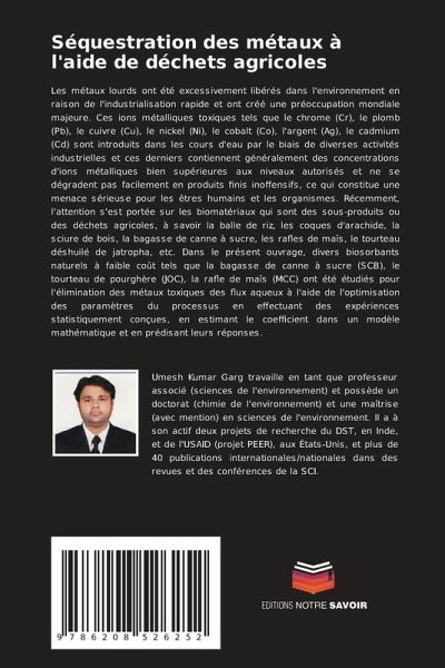 Les métaux lourds ont été excessivement libérés dans l'environnement en raison de l'industrialisation rapide et ont créé une préoccupation mondiale majeure. Ces ions métalliques toxiques tels que le chrome (Cr), le plomb (Pb), le cuivre (Cu), le nickel (Ni), le cobalt (Co), l'argent (Ag), le cadmium (Cd) sont introduits dans les cours d'eau par le biais de diverses activités industrielles et ces derniers contiennent généralement des concentrations d'ions métalliques bien supérieures aux niveaux autorisés et ne se dégradent pas facilement en produits finis inoffensifs, ce qui constitue une menace sérieuse pour les êtres humains et les organismes. Récemment, l'attention s'est portée sur les biomatériaux qui sont des sous-produits ou des déchets agricoles, à savoir la balle de riz, les coques d'arachide, la sciure de bois, la bagasse de canne à sucre, les rafles de maïs, le tourteau déshuilé de jatropha, etc. Dans le présent ouvrage, divers biosorbants naturels à faible coût tels que la bagasse de canne à sucre (SCB), le tourteau de pourghère (JOC), la rafle de maïs (MCC) ont été étudiés pour l'élimination des métaux toxiques des flux aqueux à l'aide de l'optimisation des paramètres du processus en effectuant des expériences statistiquement conçues, en estimant le coefficient dans un modèle mathématique et en prédisant leurs réponses.