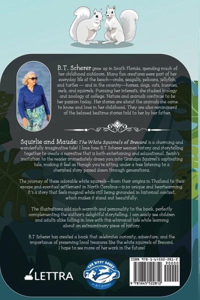 B.T. Scherer grew up in South Florida, spending much of her childhood outdoors. Many fun creatures were part of her everyday life at the beach-crabs, seagulls, pelicans, jellyfish, and turtles - and in the country-horses, dogs, cats, bunnies, owls, and squirrels. Pursuing her interests, she studied biology and zoology at college. Nature and animals continue to be her passion today. Her stories are about the animals she came to know and love in her childhood. They are also reminiscent of the beloved bedtime stories told to her by her father. Squirlie and Maude: The White Squirrels of Brevard is a charming and wonderfully imaginative tale! I love how B.T. Scherer weaves history and storytelling together to create a narrative that is both entertaining and educational. Swish's invitation to the reader immediately draws you into Grandpa Squirrel's captivating tale, making it feel as though you're sitting under a tree listening to a cherished story passed down through generations. The journey of these adorable white squirrels-from their origins in Thailand to their escape and eventual settlement in North Carolina-is so unique and heartwarming. It's a story that feels magical while still being grounded in historical context, which makes it stand out beautifully. The illustrations add such warmth and personality to the book, perfectly complementing the author's delightful storytelling. I can easily see children and adults alike falling in love with this whimsical tale while learning about an extraordinary piece of history. B.T. Scherer has created a book that celebrates curiosity, adventure, and the importance of preserving local treasures like the white squirrels of Brevard. I hope to see more of her work in the future!