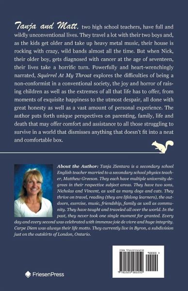 Tanja and Matt, two high school teachers, have full and wildly unconventional lives. They travel a lot with their two boys and, as the kids get older and take up heavy metal music, their house is rocking with crazy, wild bands almost all the time. But when Nick, their older boy, gets diagnosed with cancer at the age of seventeen, their lives take a horrific turn. Powerfully and heart-wrenchingly narrated, Squirrel At My Throat explores the difficulties of being a non-conformist in a conventional society, the joy and horror of raising children as well as the extremes of all that life has to offer, from moments of exquisite happiness to the utmost despair, all done with great honesty as well as a vast amount of personal experience. The author puts forth unique perspectives on parenting, family, life and death that may offer comfort and assistance to all those struggling to survive in a world that dismisses anything that doesn't fit into a neat and comfortable box.
