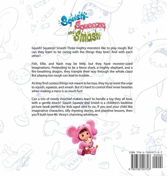 Squish! Squeeze! Smash! Three mighty monsters like to play rough. But can they learn to be caring with the things they love? And with each other? Fish, Ellie, and Nash may be little, but they have monster-sized imaginations. Pretending to be a fire-breathing dragon, a mighty elephant, and a fierce shark, they trample their way through the whole class! But playing too rough can lead to trouble… As they find curious things not meant to be toys, they try to resist the urge to squish, squeeze, and smash. But it's hard to control their inner beasties when making a mess is so much fun! Can a trio of rowdy mischief-makers learn to handle a toy they all love, with a gentle touch? Squish Squeeze and Smash is a children's bedtime picture book perfect for kids aged zero to six. If you and your child like imaginative characters, silly rhyming stories, and playtime lessons, then you'll both love Mr. Vinny's charming adventure. Buy Squish Squeeze and Smash to laugh along with three make-believe monsters today!
