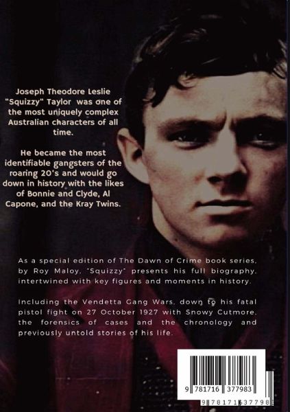 SQUIZZY - Second Edition Comparable to only Al Capone, Ned Kelly, the Kray Twins and Bonnie and Clyde, Squizzy Taylor was one the most prolific and iconic criminals in the history of Western civilisation. In the 100 years since his death, almost no author has had the tenacity to take on the enormous task of compiling a biography of the man who existed behind the legend that became Squizzy Taylor. But now, Australia's most prolific true crime biographer, Roy Maloy, presents the story of Squizzy Taylor in one complete work. In this second edition with over 600 pages that includes over 50 photographs, witness statements, forensics reports and police testimonies, the entirety of Squizzy's life of crime is finally told! Spanning over 150 years of history, from his father's upbringing in Sandhurst, through his adolescence as a street pickpocket, violent thug and standover man, passing by the Fitzroy Vendetta, and his yearlong escape from the law with Ida Pender to the pistol fight that took his life, this is truly an epic and spectacular work that finally preserves and presents the father of modern Australian crime - Squizzy Taylor.