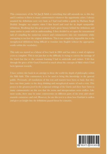 This commentary of the Sr¿ Jap J¿ S¿hib is something that still astounds me to this day and I continue to listen to many commentaries whenever the opportunity arises. I always assumed the definitions were very basic as I had read within a gutk¿ by Harbans Singh Döbi¿. Imagine my surprise when I first heard and read the in depth sampard¿ic definitions. Realising that this great prayer had a great history behind the definitions and many stories to assist with its understanding. I then decided to set upon the monumental task of compiling the numerous sources and commentaries into one translation whilst attempting to not lose the original definitions. This is not completely impossible due to the metaphysical definitions being difficult to translate into English without the appropriate words within the vocabulary. This task was started as a labour of love back in 2004 and has taken a total of eighteen years to complete. This is not just due to the difficulty in trying to convey the message of the Gur¿ but due to the constant learning I had to undertake and endure. I felt that through the grace of the Gur¿ I learned so much about the concepts of Sikh¿ which I had been ignorant towards. I have written this book in an attempt to show the world the depth of philosophy within the Sikh faith. This commentary is to be used to bring this knowledge to the general public. Previously, all translations of this text and mantr¿ have been so basic that they have not done justice to the deep thinking and metaphysical nature of such a text. This prayer is the greatest jewel in the scriptural writings of the Gur¿s and there have been so many commentaries on this text that the terms and interpretations seem endless. Like most works, there may be some controversies on different parts of the texts and where mantr¿s commence and end. However, for me this text is to show how Gurb¿n¿ is endless and gives an insight into the definitions passed down for centuries.