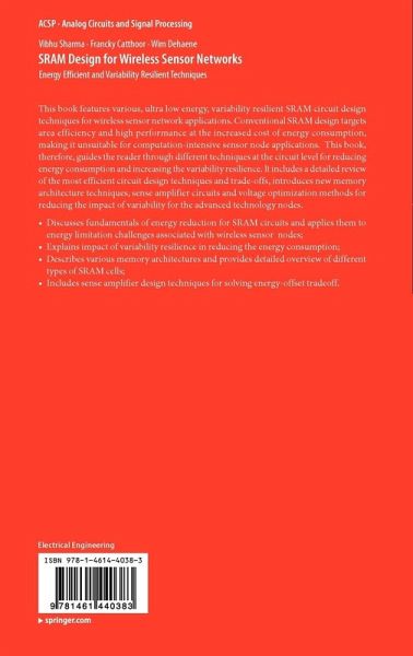 This book features various, ultra low energy, variability resilient SRAM circuit design techniques for wireless sensor network applications. Conventional SRAM design targets area efficiency and high performance at the increased cost of energy consumption, making it unsuitable for computation-intensive sensor node applications. This book, therefore, guides the reader through different techniques at the circuit level for reducing energy consumption and increasing the variability resilience. It includes a detailed review of the most efficient circuit design techniques and trade-offs, introduces new memory architecture techniques, sense amplifier circuits and voltage optimization methods for reducing the impact of variability for the advanced technology nodes.