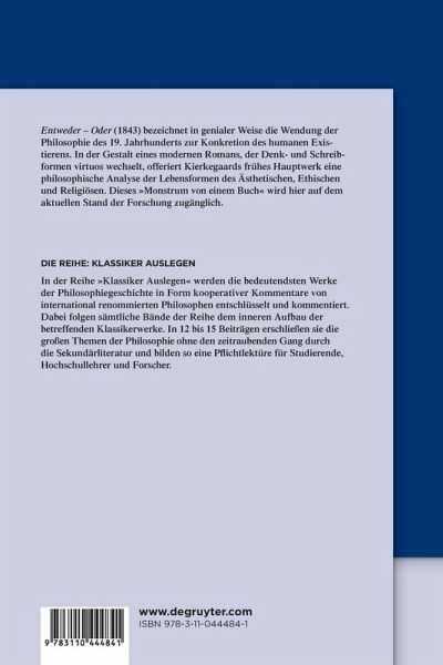 Søren Kierkegaards frühes Hauptwerk Entweder - Oder (1843) bezeichnet in genialer Weise die Wendung der Philosophie des 19. Jahrhunderts zur Konkretion des humanen Existierens in Handlungssituationen. Damit steht dieses "Monstrum von einem Buch" in der Tradition von Idealismus und Romantik, um sie zu verabschieden: In der Art eines modernen Romans, der die Sprachformen virtuos wechselt, zugleich in der Analyse der Lebensformen des Ästhetischen, Ethischen und Religiösen. "Papiere von A" heißen die gesammelten Aphorismen, Mozart-Interpretationen, schwermütigen Texte samt "Tagebuch des Verführers" - "Papiere von B" die beiden großen Lehrbriefe zur Verteidigung der Ehe und des ethisch Allgemeinen überhaupt. So erscheint die ästhetische Unmittelbarkeit als Krise, die Ethik der Selbst-Wahl als Lösung, die wiederum im religiösen Selbst-Verhältnis ihre ultimative Grenze ahnen lässt.