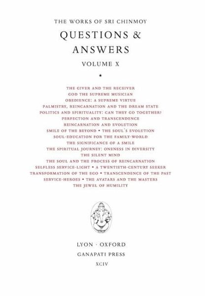 Sri Chinmoy offers illumining answers to spiritual questions. This collection includes the books The giver and the receiver, God the Supreme Musician, Obedience: a supreme virtue, Palmistry, reincarnation and the dream state, Politics and spirituality: can they go together?, Perfection and transcendence, Reincarnation and evolution, Smile of the Beyond, The soul's evolution, Soul-education for the family-world, The significance of a smile, The spiritual journey: oneness in diversity, The silent mind, The soul and the process of reincarnation, Selfless service-light, A twentieth-century seeker, Transformation of the ego, Transcendence of the past, Service-heroes, The Avatars and the Masters, and The jewel of humility.