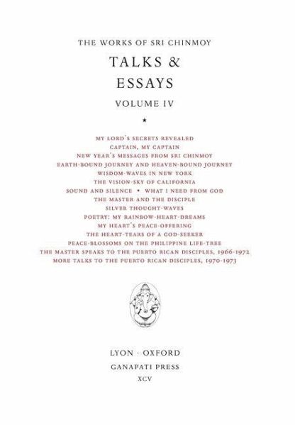 Inspirational spiritual talks, messages and answers by Sri Chinmoy from original books, including My Lord's Secrets revealed, Captain, my Captain, New Year's Messages from Sri Chinmoy Earth-bound journey and Heaven-bound journey, Wisdom-waves in New York, The Vision-Sky of California, Sound and silence, What I need from God, The Master and the disciple, Silver thought-waves, Poetry: My Rainbow-Heart-Dreams, My heart's peace-offering, The heart-tears of a God-seeker, Peace-Blossoms on the Philippine life-tree, The Master speaks to the Puerto Rican disciples