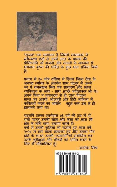 'Srijan' is a heartfelt state of a common man feeling who is devoted to the God Krishna. A beautiful penory by writer to pen down the deotional thoughts in the form of poerty. Writer has a preference of writing his poetries in the literature of Bhojpuri, Awadhi and the Hinidi. This book is written and decicated to all his followers and well wishers with his own beautiful poetrries. Since years I have been securing his old papers and willing to fullfill his wish to have a book of his creations. 'Srijan' will actually be a tribute to his wonderfull works and memories.