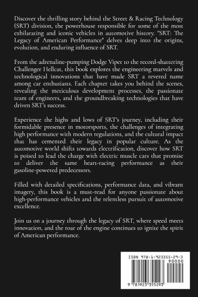 Discover the thrilling story behind the Street & Racing Technology (SRT) division, the powerhouse responsible for some of the most exhilarating and iconic vehicles in automotive history. "SRT: The Legacy of American Performance" delves deep into the origins, evolution, and enduring influence of SRT. From the adrenaline-pumping Dodge Viper to the record-shattering Challenger Hellcat, this book explores the engineering marvels and technological innovations that have made SRT a revered name among car enthusiasts. Each chapter takes you behind the scenes, revealing the meticulous development processes, the passionate team of engineers, and the groundbreaking technologies that have driven SRT's success. Experience the highs and lows of SRT's journey, including their formidable presence in motorsports, the challenges of integrating high performance with modern regulations, and the cultural impact that has cemented their legacy in popular culture. As the automotive world shifts towards electrification, discover how SRT is poised to lead the charge with electric muscle cars that promise to deliver the same heart-racing performance as their gasoline-powered predecessors. Filled with detailed specifications, performance data, and vibrant imagery, this book is a must-read for anyone passionate about high-performance vehicles and the relentless pursuit of automotive excellence. Join us on a journey through the legacy of SRT, where speed meets innovation, and the roar of the engine continues to ignite the spirit of American performance.