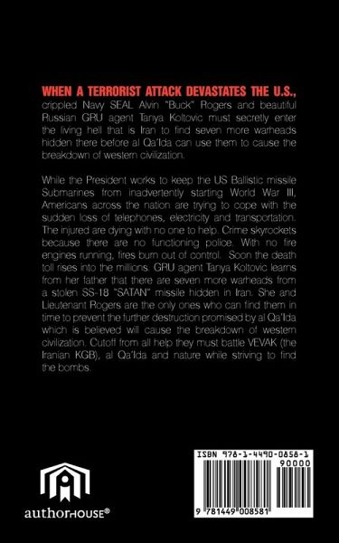 When a terrorist attack devastates the U.S., crippled Navy SEAL Alvin "Buck" Rogers and beautiful Russian GRU agent Tanya Koltovic must secretly enter the living hell that is Iran to find seven more warheads hidden there before al Qa'Ida can use them to cause the breakdown of western civilization. While the President works to keep the US Ballistic missile Submarines from inadvertently starting World War III, Americans across the nation are trying to cope with the sudden loss of telephones, electricity and transportation. The injured are dying with no one to help. Crime skyrockets because there are no functioning police. With no fire engines running, fires burn out of control. Soon the death toll rises into the millions. GRU agent Tanya Koltovic learns from her father that there are seven more warheads from a stolen SS-18 "SATAN" missile hidden in Iran. She and Lieutenant Rogers are the only ones who can find them in time to prevent the further destruction promised by al Qa'Ida which is believed will cause the breakdown of western civilization. Cutoff from all help they must battle VEVAK (the Iranian KGB), al Qa'Ida and nature while striving to find the bombs.