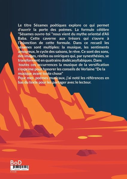 Le titre Sésames poétiques explore ce qui permet d'ouvrir la porte des poèmes. La formule célèbre "Sésames ouvre-toi "nous vient du mythe oriental d'Ali Baba. Cette caverne aux trésors qui s'ouvre à l'injonction de cette formule. Dans ce recueil les sésames sont multiples: la musique, les sentiments amoureux, le cycle des saisons, le rêve. Ce sont des sons, des images, réelles ou oniriques qui, par synesthésies, se transforment en quatrains dodécasyllabiques. Dans toutes ces occurrences la musique de la versification s'exprime pour honorer les conseils de Verlaine "De la musique avant toute chose"Pour mes poèmes musicaux, j'ai noté les références en bas du texte pour les partager avec le lecteur.