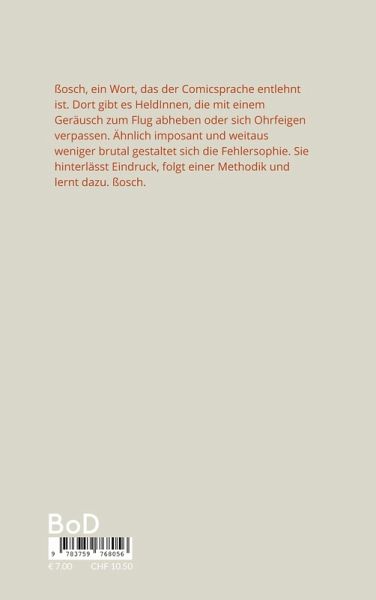 ßosch, ein Wort, das der Comicsprache entlehnt ist. Dort gibt es HeldInnen, die mit einem Geräusch zum Flug abheben oder sich Ohrfeigen verpassen. Ähnlich imposant und weitaus weniger brutal gestaltet sich die Fehlersophie. Sie hinterlässt Eindruck, folgt einer Methodik und lernt dazu. ßosch.
