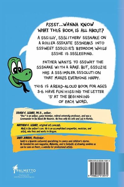 Sssweet Sssuzie is sssleeping when a sssilly, ssslithery sssnake zooms into her room on a roller ssskate. Father comes in with a rake to get rid of the sssnake. Sssusie sssuggests a sssimpler sssolution that ends up making everybody happy. This Read-Aloud Book will become a favorite bedtime ssstory for 4-6-year-olds when the first letter 's' of each word has a hissing sssound.Recipient of 2024 President's Book Awards Silver Medal Winner (Florida Authors and Publishers Association)